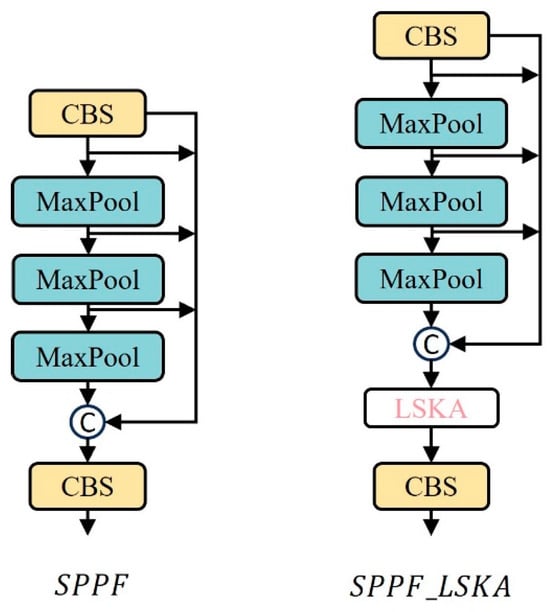 The multi-scale feature extraction module is an important part of the YOLO series of algorithms, typically located at the end of the backbone network, with a fixed output size. SPPF redesigns the structure based on the SPP module [37]. Its output purpose remains unchanged, but every time a feature passes through a pooling layer, the result is retained. After the feature undergoes three maximum pooling processes, all the results obtained will be concatenated. The advantage of this method is that it greatly reduces the computational load and parameter volume brought by the multi-scale feature extraction module, and greatly improves the running speed and efficiency of the model. However, its disadvantage is that its ability to extract spatial information at different scales is not as good as the SPP module. Therefore, this paper integrates the LSKA lightweight attention mechanism module into the SPPF module, and under the premise of almost no increase in model computation and parameter volume, improves its ability to extract spatial information at different scales.