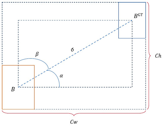 Herein, represents the center point of the predicted box, and represents the center point of the actual box. is the square of the Euclidean distance between the two center points. represents the length of the diagonal of the minimum bounding region (the smallest rectangular box area that can contain both the predicted box and the actual box). α is a trade-off parameter, and is used to measure the aspect ratio. The formulas for α and are as follows:
