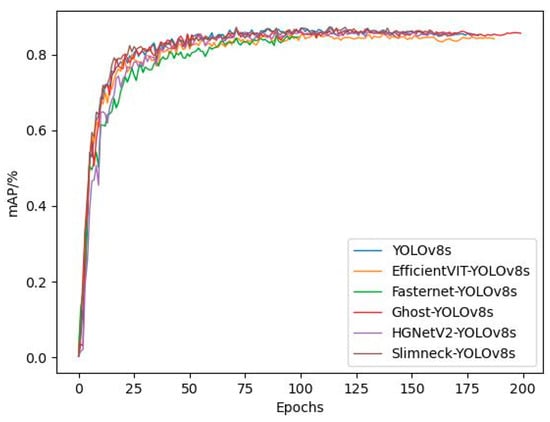 Considering the comprehensive comparison of model performance and complexity, Ghost_YOLOv8s is the optimal choice. Although its mAP50 and mAP50–95 values differ from YOLOv8s by 0.8% and 0.2%, respectively, its Recall is 1.0% higher than YOLOv8s, and it has the highest degree of lightweighting. The comparison of the training mAP of all models is shown in Figure 13. As can be seen from the figure, due to the presence of the early stopping mechanism, the convergence speed of EfficientVIT_YOLOv8s and Ghost_YOLOv8s models is slower than YOLOv8s, with YOLOv8s, triggering the early stopping mechanism and completing training around the 180th round. The FasterNet_YOLOv8s model has the fastest convergence speed, converging around the 110th round. The difference in mAP values among all models is not significant, but there is a large span in convergence speed.