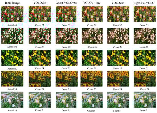 The performance of different lightweight models in flower counting is shown in Figure 14. As can be seen from the figure, although YOLOv7-tiny has an advantage in terms of lightweighting, its counting performance is not satisfactory. The counting performance of Ghost-YOLOv5s shows a good combination of detection speed and accuracy, and it can also have a good counting performance while being lightweight. Light-FC-YOLO’s counting performance in all flower categories is superior to other lightweight models. Although there are slight omissions, there are almost no false detections. It successfully identifies most of the targets in the multi-target flower images and has the best counting performance. Compared with YOLOv8s, Light-FC-YOLO achieves higher counting accuracy under the premise of being more lightweight. In addition, due to the introduction of the LSKA attention mechanism, the shape encoding information of the target is more focused on in the network. In this group of tulip, sunflower, and rose test images, there are many areas with poor lighting conditions and slight reflections on the target surface, but Light-FC-YOLO can overcome the impact in the counting operation and complete the recognition well.