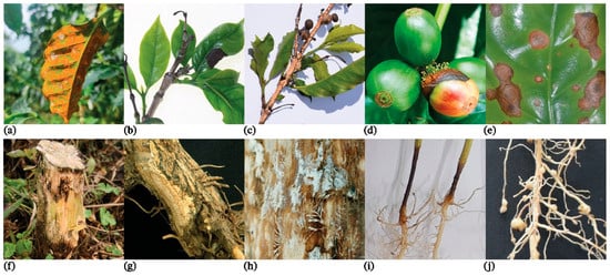 Symptoms of main diseases in coffee plantations in Colombia across different tissues and plant organs. (a) Coffee leaf rust (Hemileia vastatrix). (b) Plant tips showing dieback (Phoma sp.). (c) Coffee branch with pink disease (Corticium salmonicolor). (d) American leaf spot (Mycena citricolor) on fruits. (e) Close view of iron spot (Cercospora coffeicola) on leaves. (f) Ceratocystis canker stain (Ceratocystis fimbriata) on stumping plant, (g,h) Rosellinia root rot (Dematophora pepo and Dematophora bunodes) on plant roots. (i) Damping off (Rhizoctonia solani) in coffee nursery plants. (j) Root knot (Meloidogyne spp.) in coffee nursery plants. Images from Cenicafé´s archive.