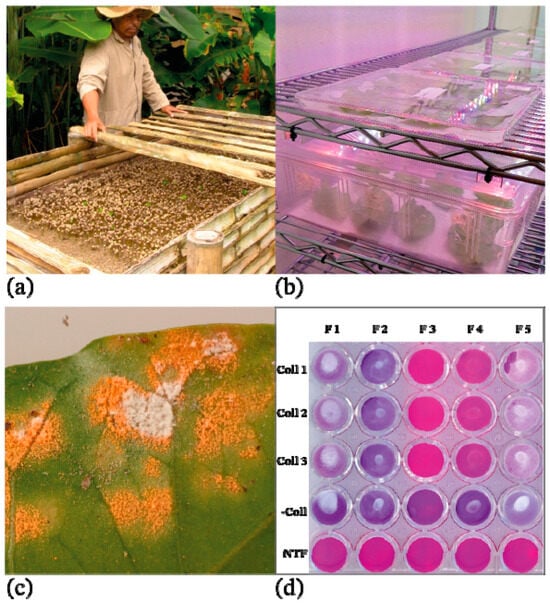 Technical components of the integrated disease management used in the sustainable production of Colombian coffee: (a) Cultural and physical control of seedling damping off caused by Rhizoctonia solani: utilization of germination beds filled with washed river sand to mitigate seedling attacks. (b) Genetic control of CLR: screening coffee genotypes under controlled conditions through detached leaf inoculation tests to identify resistant varieties against the fungus. (c) Biological control of CLR (orange uredospores) by Lecanicillium lecanii (white mycelium) in field infections. (d) Colletotrichum spp.’s response to fungicides in vitro: assessment of three strains of Colletotrichum spp. (rows Coll 1, Coll 2 and Coll 3) with five fungicides (columns F1, F2, F3, F4 and F5) utilizing resazurin sodium salt [] to indicate fungicidal effectiveness, measured by the absence of metabolic activity in mycelium disks (initial purple color), compared with not treated wells (NTF). Images from Cenicafé´s archive.
