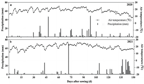 Daily precipitation and average temperature during the growing seasons of spring maize in (a) 2020 and (b) 2021 at Changwu, Shaanxi Province, China.