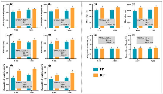 In 2020 and 2021, compared to the FP system, at the N180 nitrogen level, the ear height of spring maize in the RF system increased by 13.6% and 22.1%, respectively (Figure 3e,f); at the N300 level, the increases were 13.5% and 13.2%, respectively. Compared to the N180 level, in 2020 at the N300 level, the average increase in ear height for spring maize under both RF and FP systems was 7.3%, and in 2021 it was 3.1%. Compared to the N180 level, the average increase in ear position coefficient over two years at the N300 level was 0.7% (Figure 3g,h). Compared to the FP system, the average increase in ear position coefficient over two years of the RF system was 1.6%.