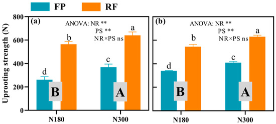Effects of nitrogen application rate and planting system and nitrogen application rate on root pulling force of spring maize in 2020 (a) and 2021 (b). Different lowercase letters indicate significant differences at p ≤ 0.05 level, and different capital letters indicate significant differences in nitrogen application amount (p < 0.05). ** significant differences at p < 0.01; ns indicates a non-significant difference.