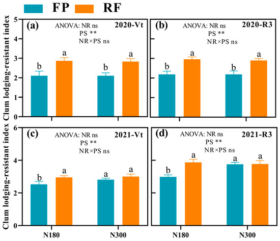 Effects of nitrogen application rate and planting system on lodging resistance index of spring maize stalk during Vt (a,c) and R3 (b,d) stage in 2020 (a,b) and 2021 (c,d). Different lowercase letters indicate significant differences at p ≤ 0.05 level. ** significant differences at p < 0.01; ns indicates a non-significant difference.
