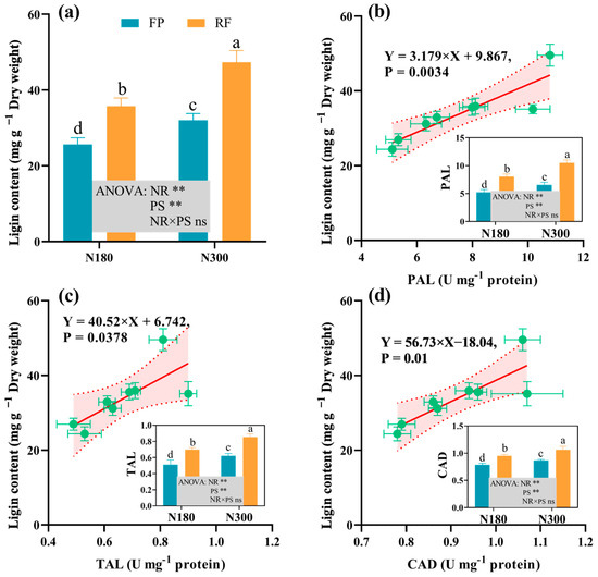 Effects of nitrogen application rate and planting system on lignin (a), PAL (b), TAL (c), and CAD (d) of spring maize stalks, average for 2020 and 2021. Different lowercase letters indicate significant differences at p ≤ 0.05 level. ** significant differences at p < 0.01; ns indicates a non-significant difference. The red lines represent linear fitting lines for different enzymes, p-value were test at 0.05 level.
