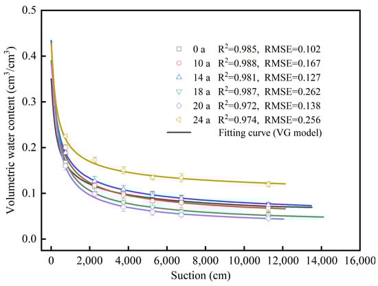 Soil water characteristic curve of soils with different MDI application years (0 a–24 a). Different symbols represent the volumetric water content at a specific pressure obtained using the pressure film instrument. Color lines represent the simulated value of the SWCC curve obtained using RETC6.02 software. The error bars represent the standard deviation (n = 3).