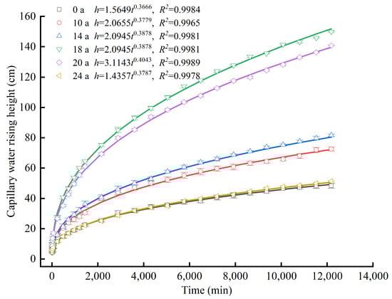 Capillary water rising height with time variation in different MDI application years (0 a–24 a). Color lines represent the change in capillary water rising height over time fitted with an exponential function. The error bars represent the standard deviation (n = 3).