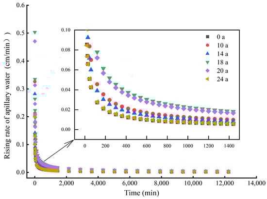 Rising rate of capillary water with time variation in different MDI application years (0 a–24 a). Different symbols represent the average rate of wetting front migration over time.