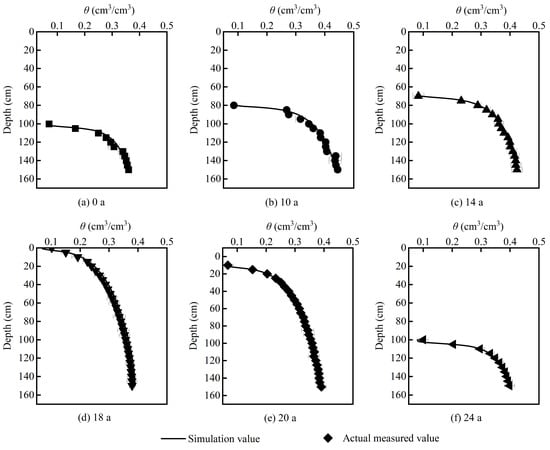 Accurately predicting the distribution of soil water content profiles is of great significance for improving water resource utilization in arid and semi-arid regions of Northwest China. After completing the vertical one-dimensional soil column capillary rise experiment, soil samples were taken in layers of 5 cm from bottom to top to determine the volumetric soil water content, thereby obtaining the distribution of the soil water content at different depths. The HYDRUS-1D model was used to analyze the fitted soil water content profiles for MDI application years. From Figure 6, it can be observed that the volumetric soil water content decreases with decreasing depth for soils with different application years.