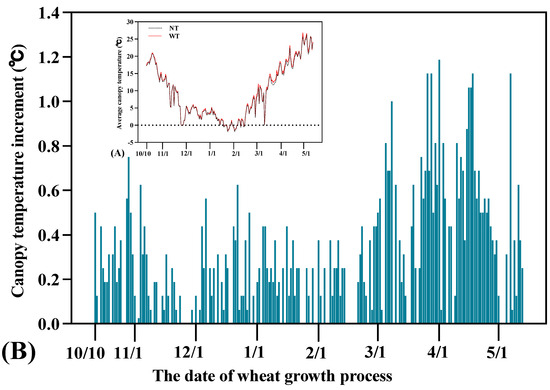The change in the canopy temperature at night during the growth period of wheat is shown in Figure 1A. The canopy temperature for normal and nighttime warming ranged from −1.88 °C to 26.25 °C and −1.75 °C to 26.62 °C, respectively, and their average temperature was 9.46 °C and 9.73 °C, respectively. Additionally, as the growth period progressed, the temperature continued to decrease, and the lowest canopy temperature was observed at the end of January and early February, followed by a gradual increase. The increment in the canopy temperature at night under nighttime warming is displayed in Figure 1B. Except for rainy and snowy days, the canopy temperature under WT was higher than that under NT, indicating that the passive warming device had a notable warming effect. The warming effect was similar to that reported in the study by Chen et al. [34], who observed a warming effect using a passive warming device. Throughout the growth period of wheat, the average temperature increment was 0.28 °C. The soil–plant system temperature increased under the passive nighttime warming system, mainly by intercepting long-wave radiation on the ground at night to achieve the purpose of warming [35]. From October to May of the following year, the average increment during warming was 0.28 °C, and the temperature increment in each month was 0.26, 0.12, 0.20, 0.18, 0.17, 0.46, 0.57, and 0.26 °C, respectively. Considering these results, the best warming effect was observed in the flowering and booting stages. Prior reports also found that the warming effect of a passive warming device was obvious from the booting stage [28,35,36], and a high night temperature during grain number determination might hinder grain filling [36], which may be the main reason for the decrease in wheat production under nighttime warming. Overall, the warming effect of the night warming system was prominent.