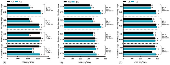 Antioxidant enzyme activities of leaves, including POD (A), SOD (B), and CAT (C). Data were analyzed by two-way ANOVA (W/WT, warming treatment; NT, no-warming treatment; CK, no-Cu application; Cu, Cu application; ns, not significant; *, p < 0.05; **, p < 0.01; ***, p < 0.001). Different letters at the same growth stage represent a significant difference among treatments (p < 0.05). Abbreviation: POD, Peroxidase; SOD, Superoxide dismutase; CAT, Catalase.