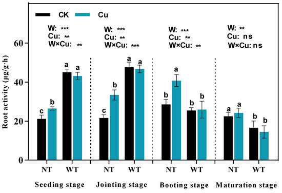 Root activities. Data were analyzed by two-way ANOVA (W/WT, warming treatment; NT, no-warming treatment; CK, no-Cu application; Cu, Cu application; ns, not significant; **, p < 0.01; ***, p < 0.001). Different letters at the same growth stage represent a significant difference among treatments (p < 0.05).