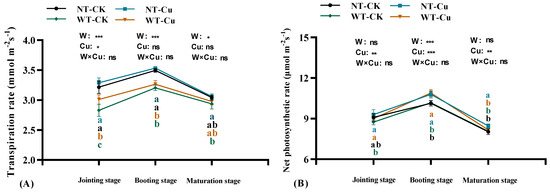 Leaf transpiration rate (A) and net photosynthetic rate (B). Data were analyzed by two-way ANOVA (W/WT, warming treatment; NT, no−warming treatment; CK, no−Cu application; Cu, Cu application; ns, not significant; *, p < 0.05; **, p < 0.01; ***, p < 0.001). Different letters at the same growth stage represent a significant difference among treatments (p < 0.05).