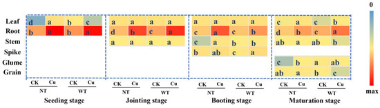 Heatmaps of Cu concentration in different tissues of wheat. Data were analyzed by a two-way ANOVA. Different letters in the same phenological stage (a, b, c) represent a p < 0.05 significant difference at the same sampling point. Blue and red indicate the smaller and larger Cu concentrations, respectively; the dark and light of colors indicate the degree of strength and weakness, respectively.