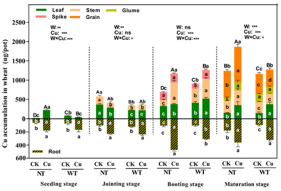 Cu accumulation in different tissues of wheat. Data were analyzed by two-way ANOVA (W/WT, warming treatment; NT, no-warming treatment; CK, no-Cu application; Cu, Cu application; ns, not significant; *, p < 0.05; **, p < 0.01; ***, p < 0.001). Different letters in tissues at the same growth stage represent a significant difference in Cu accumulation of the tissue among treatments (p < 0.05). The lowercase (a, b, c) and uppercase (A, B, C) letters on the histogram above the abscissa axis represent the significant differences in the Cu accumulation of the aboveground and whole plant, respectively (p < 0.05). The lowercase (a, b, c) letters under the bar graph below the abscissa axis represent significant differences in the Cu accumulation underground (p < 0.05).