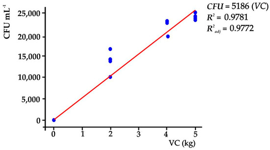Likewise, Gram-positive bacteria were found in the substrates, with Bacillus spp. being identified in the majority. It was also established that the amount of VC in the substrates influenced the CFU (α ≤ 0.05), where the highest CFU (34,400 CFU mL−1) was found in T3 (Tukey, p ≤ 0.05). In this sense, CFUs were a function of the amount of VC in the substrates; when the amount of VC in the substrate was increased by one unit (1 kg), the CFU increased by 5189 CFU mL−1 in the substrate; the regression model, in other words, can explain 98.81% of the variation of CFU (p ≤ 0.05) in the substrates that were used (Figure 1).
