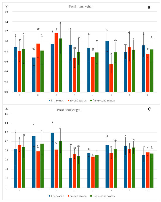 Influence of different methods of vitamin PP application on the fresh weight (A–C) of spring barley var. Eunova growing in soil with 1 mM Pb(NO3)2; A–spike, B–stem, C–root; (1) control, (2) 100 µM Vit PP soaking seeds, (3) 100 µM Vit PP foliar application, (4) 100 µM Vit PP soil application, (5) 1 mM Pb(NO3)2, (6) 1 mM Pb(NO3)2 + 100 µM Vit PP soaking seeds, (7) 1 mM Pb(NO3)2 + 100 µM Vit PP foliar application, (8) 1 mM Pb(NO3)2 + 100 µM Vit PP soil application; a–b—homogeneous groups.