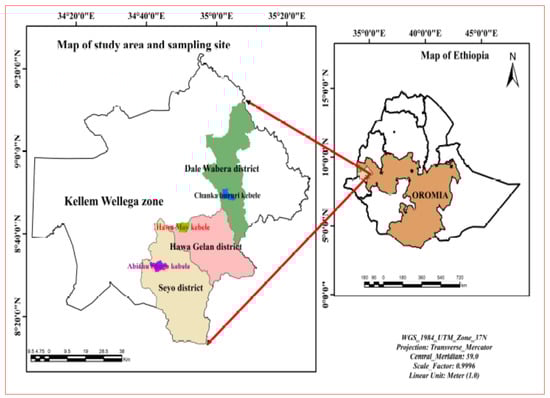 Figure 1. Geographical location of the study area for Sayo, Hawa Gelan, and Dale Wabara districts in Kellem Wellega zone, Western Ethiopia.