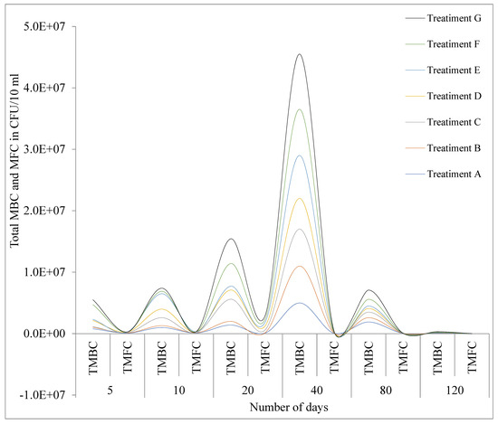 By day 40, treatment of compost G maintains dominance with the highest TMBC count at 9 × 106, contrasting sharply with treatment A’s count of 5 × 106 colony-forming units (cfu). For TMFC, all treatments exhibit relatively low counts compared to previous days.