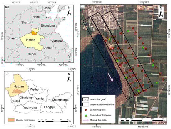Study area: (a) Henan province; (b) Xinxiang city and Zhaogu mining area; (c) the study area.