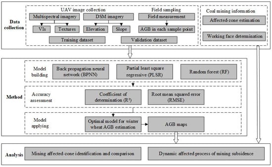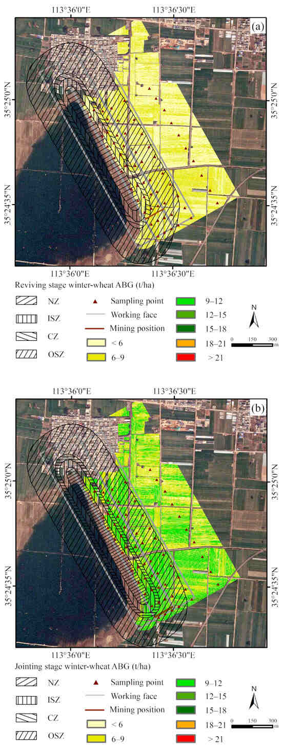 In this context, this study aims to propose a UAV remote sensing-based AGB estimation model for analyzing the spatiotemporal variation of winter wheat AGB during coal mining and to study the dynamic influence of mining on crop growth in the CGOA. Zhaogu Coal Mine, which is a typical CGOA with a high water table on the North China Plain, is taken as the study area. Firstly, the study proposes different AGB estimation models based on terrain data, textures, and vegetation indices by using the regression techniques of random forest (RF), the partial least squares (PLSR), and the backpropagation neural network (BPNN). Secondly, the estimation model with the best accuracy is used to estimate winter wheat AGB at three growth stages. Finally, based on the estimated wheat AGB and the coal mining process, the study attempts to pinpoint the impact of underground coal mining on aboveground crop growth. The findings will support the partitional agricultural management and targeted land reclamation, and contribute to concurrent management between aboveground cultivated land protection and underground coal mining in CGOA. The proposed AGB estimation methods will further expand the UAV remote sensing applications in CGOA with high groundwater levels.