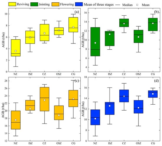 Winter wheat AGB (t/ha) statistics: (a) AGB at reviving stage; (b) AGB at jointing stage; (c) AGB at heading stage; (d) mean of three stages.