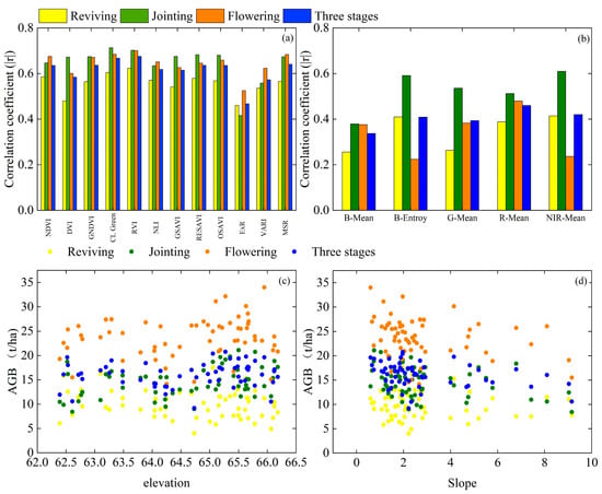 Figure 4 reflects the relationship between the selected remote sensing parameters and the measured AGB. Figure 4a,b reflect the correlation coefficient between VIs and texture data, and AGB. Four colors represent the reviving stage, jointing stage, flowering stage, and all the three stages. The results in Figure 4a,b show that (i) most VIs have a positive correlation (higher than 0.6) with AGB in different growth stages, such as CL Green, RVI, and MSR; (ii) most textures have a weak correlation with AGB in different growth stages (changing from 0.2 to 0.5); and (iii)comparing three growth stages, the correlation coefficient at the jointing stage is higher. Figure 4c,d show measured AGB with the elevation and slope information. Points with four colors represent the different AGB of different growth stages.