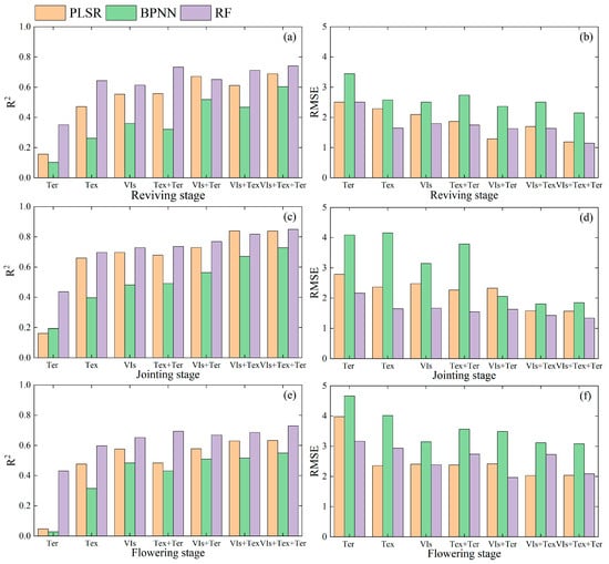 Accuracy of winter wheat AGB estimation for different techniques and different data combinations at different wheat-growth stages: (a,c,e) R2; (b,d,f) RMSE.