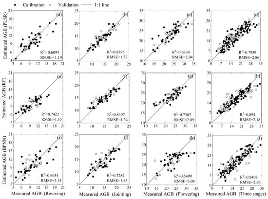The study uses (i) PLSR, BPNN, and RF and (ii) VI data, texture data, terrain data, and different combinations of these data to estimate AGB through three growth stages. Figure 5 shows the AGB estimation results (R2 and RMSE) of different techniques when using different combinations of selected data. The results in Figure 5 present the fact that (i) with the addition of terrain and texture data, the accuracy of the AGB estimate gradually improves. In other words, compared to only using VI data, when combining three datasets, the AGB estimation accuracy increases. For example, when using PLSR, the accuracy shows a 0.23 increase in R2 and a 1.69 t/ha reduction in RMSE; when using BPNN, the accuracy shows a 0.28 increase in R2 and a 1.36 t/ha reduction in RMSE; when using RF, the accuracy shows a 0.05 increase in R2 and a 0.55 t/ha reduction in RMSE. (ii) As the AGB increased with the wheat growth, the AGB estimate based on a single data set may underestimate samples with high AGB values. For example, when using VI data to estimate AGB, the flowering stage (validation R2: 0.48–0.65) has a lower estimated accuracy compared with the jointing stage (validation R2: 0.48–0.73). Therefore, it is beneficial to use three datasets to inverse the AGB in different growth stages.
