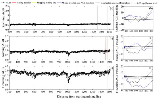 Figure 8 shows that (i) at the reviving stage, the position of the coal mining is around 1350 m. The AGB profile and trendline show the AGB increases from 310 m to 1000 m, and from 1230 m to 1500 m. The AGB decreases from 1000 m to 1230 m, and shows a significant decrease between 1030 m and 1200 m; and (ii) at the jointing stage, the position of the coal mining is around 1460 m. The increasing trend in AGB can be observed from 310 m to 1020 m, and 1280 m to 1500 m. The decreasing trend in AGB can be observed from 1020 m to 1280 m, and it is significant from 1030 m to 1220 m; and (iii) at the flowering stage, the whole working face has been completed. The significantly decreasing trend of AGB can be observed from 400 m to 1500 m. Compared with the AGB trendline of the unaffected area, the AGB trendline of the mining affected area shows that (i) both AGB trendlines show fluctuations, probably due to the differences in cropland management; however, (ii) the trendlines of the unaffected area show a similar fluctuation tendency from the reviving to the flowering stage, while the trendlines of the mining affected area show significant changes during mining. For example, the range with significant decreasing AGB gradually expands from 1030 m to 1200 m at the reviving stage, 1030 m to 1220 m at the jointing stage, and 400 m to 1500 m during the flowering stage. Therefore, as the mining proceeds, the area where AGB is significantly affected by coal mining gradually expands, and even areas where AGB had previously significantly increased gradually transition to a significant decrease.