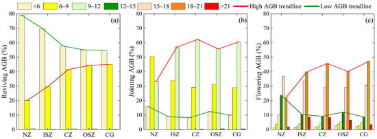 The area proportion of winter wheat at different AGB levels in different zones: (a) reviving stage; (b) jointing stage; (c) flowering stage.