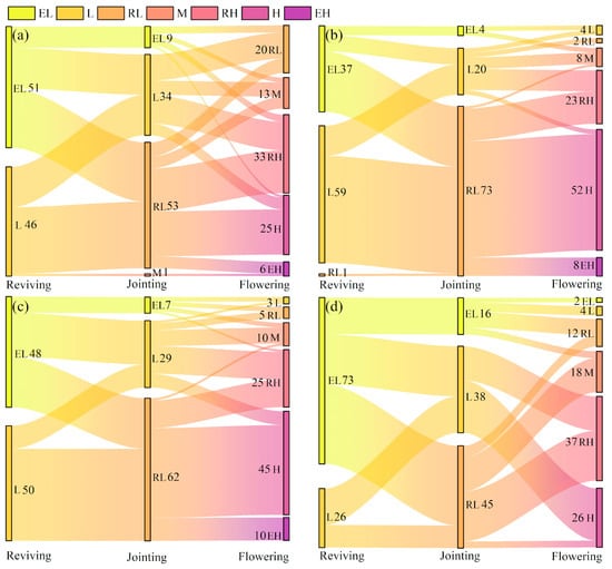 The results in Figure 10 reflect the fact that (i) at the flowering stage, the sum of RH, H, and EH of Figure 10b is the highest, reaching 83%, followed by Figure 10c, Figure 10a, and Figure 10d. Thus, until the flowering stage, the zone changing from OSZ to CZ (Figure 10b) has the best winter wheat AGB, followed by the zone changing from CZ to ISZ (Figure 10c) and the zone changing from unaffected zone to OSZ (Figure 10a), and the zone changing from ISZ to NZ has the lowest winter wheat AGB (Figure 10d); (ii) some zones have stable winter wheat AGB through all three growth stages, for example, Figure 10b shows the highest AGB at the reviving stage, and this status continues to the flowering stage, while Figure 10d shows the lowest AGB from the reviving stage to flowering stage; and (iii) some zones have similar AGB status at the reviving stage; however, with the changing of the affected coal mining zones, the AGB levels show differences at the flowering stage. For example, Figure 10a,c both have similar AGB level proportions at the reviving stage. From the reviving stage to jointing stage, Figure 10c has only 10% AGB at the L level remaining unchanged, which is less than 17% of that in Figure 10a. Meanwhile, Figure 10c has 40% AGB at L-level transfer to RL level, which is higher than 28% of that in Figure 10a. Therefore, at the jointing stage, Figure 10c has 29% AGB at L level, which is lower than 34% of that in Figure 10a, and Figure 10c has 62% AGB at RL level, which is higher than 53% of that in Figure 10a. From the jointing stage to the flowering stage, most AGB of the RL level in Figure 10c transfers to RH, H, and EH levels, with a proportion of 61%, while only 42% of the proportion of the RL level in Figure 10a transfers to RH, H, and EH levels. Therefore, at the flowering stage, the proportion of RH, H, and EH is 80% in Figure 10c, which is higher than 64% in Figure 10a.