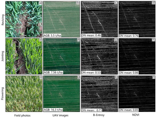 The canopy image of winter wheat is made up of leaves, shadowed leaves, stems, ears, and soil. Thus, when the resolution of multispectral imagery is high enough, the high-frequency texture information of this canopy will be rich enough [32]. In addition, the DN values of soil pixels in the multispectral imagery are uniform, which results in reduced soil texture information extracted from the gray-level co-occurrence matrix when compared to the crop canopy pixels. In Figure 4, although the selected textures have lower correlations with sampled AGB compared to the selected VIs (|r| between sampled AGB and VIs: 0.4–0.7, |r| between sampled AGB and textures: 0.2–0.6), when combined textures and VIs are used in AGB-estimation model construction, the estimation accuracy is higher than that of models constructed solely using textures or VIs (Figure 4a–d). Especially from the jointing to flowering stage, canopy structure becomes more complicated as the ears sprout (Figure 11e,i). These changes in canopy structure can be reflected by textures. Both quantitative evidence and the increased high-frequency information shown in Figure 11g,k prove that selected textures show the differences in canopy structure from the jointing stage to flowering stage, and they contribute to the higher winter wheat AGB estimation accuracy (Figure 5).