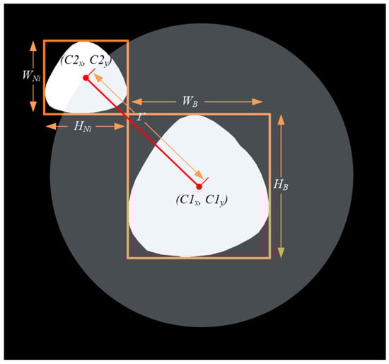 - As shown in Figure 4, calculate the position of the cap; we considered , , , , respectively, as the width and height of the bounding box of and . Furthermore, we set a movable area based on Equation (1) and generated a random point in the area of the circle with radius as the initial move position of the . The center of was mapped on according to the random point and then a mapped image was obtained.