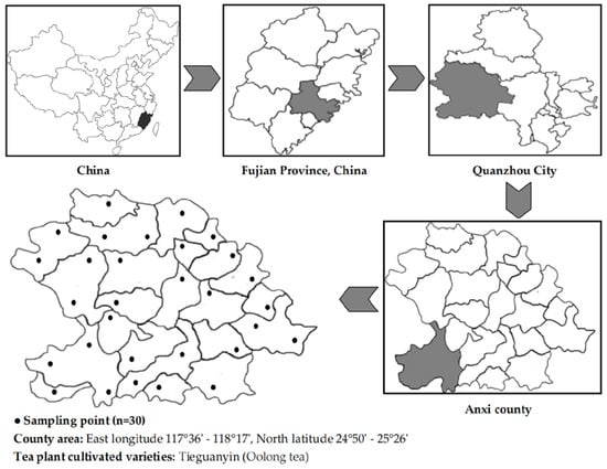 Anxi County, Quanzhou City, Fujian Province, is a major tea-producing area in China. In this study, 30 tea plantations in Anxi County, each with an area of more than 1 ha, were selected, and the tea plant varieties grown were all Tieguanyin. The specific distribution of the 30 tea plantations was shown in Figure 1, and detailed information on the location points was shown in Figure S1. During 2–17 May 2022, rhizosphere soils of tea plants and corresponding leaves were collected from 30 tea plantations on sunny days from 9 a.m. to 12 p.m. and from 2 p.m. to 5:30 p.m. to determine soil pH and elements. Five sampling sites were selected from each tea plantation, i.e., five replicates, with an interval of more than 15 m between each sampling site. Ten tea plants were selected from each sampling site, and rhizosphere soil and tea leaves were collected and thoroughly mixed separately, i.e., one replicate.
