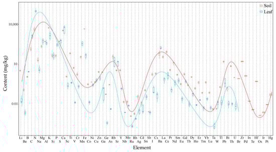Elemental analysis of rhizosphere soil samples of tea plants from 30 tea plantations showed (Table S4) that a total of 71 elements were detected in the soil, and the distribution of the total elemental amount ranged from 17.83 to 21.76 g/kg, with a mean value of 19.77 g/kg and a coefficient of variation of 5.40%. A total of 61 elements were detected in leaves of tea plants from 30 tea plantations, and the distribution of total element amount ranged from 85.33 to 179.04 g/kg, with a mean value of 114.56 g/kg and a variation coefficient of 21.52% (Table S5). This result illustrates that although there is a small difference in the total amount of elements in different tea plantation soils, the difference in soil pH leads to a significant difference in the total amount of elements in the leaves of the tea plant. Accordingly, the study further analyzed the distribution of elements in soil and tea leaves at different pH values, and the results showed (Figure 2) that the same 61 elements were detected in tea leaves and soil and the distribution of their contents was very similar, with most elements in tea leaves being higher than in soil. In addition, 10 elements such as Br, Zr, Pd, In, Te, Hf, Os, Ir, Pt and Hg were detected in soil but not in tea samples. Soil is an important source of plant elements, and plants take elements from the soil through the root system and transport them to the leaves for accumulation, but there are some differences in the ability of plants to take up and transport different elements [24,25]. This result illustrates that tea leaves are somewhat exclusive and do not selectively accumulate some elements. In addition, although soil pH is different, the distribution of elements in tea leaves and soil still has some similarity, and only the content of elements in tea leaves has changed significantly. It can be seen that soil pH significantly affects the enrichment of different elements in tea leaves.