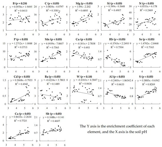 Soil is rich in elements and is the source of element absorption and accumulation in plants, which are absorbed into the soil through the root system and then transported to different parts of the plant for plant growth and development [1,2]. Plant uptake of soil elements is characterized by specificity, which comes from the selective nature of element uptake by plants themselves, on the one hand, and changes in element uptake by plants due to changes in environmental factors, on the other [3,4,5,6,7]. Soil pH has been described as a “major soil index” that affects biogeochemical cycling, and changes in soil pH can significantly affect elemental forms in the soil, which in turn affects elemental uptake by plants [8]. Appropriate soil pH facilitates the maximum uptake of soil elements by plants. Too low pH reduces the effectiveness of secondary macronutrients and increases the effective micronutrients in the soil. In addition, too low pH inhibits plant growth and not only reduces the uptake of macronutrients by the plant, but also hinders the utilization of micro-nutrients by the plant [9,10].