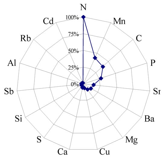 The high or low content of elements in plant leaves does not really reflect the enrichment capacity of plants for soil elements, which can be analyzed by enrichment coefficients [26]. When the enrichment coefficient is greater than 1, it indicates that the plant has an enrichment function for the element and is strong in enrichment and vice versa [27]. In order to analyze the effect of soil pH on the enrichment of tea plants for elements at a deeper level, this study further analyzed and found that for the elemental enrichment coefficients of tea leaves with different pH soils, the results showed (Table S6) that the enrichment coefficients of 44 elements in leaves of tea plants planted in soils with different pH were always less than 1, and there was the possibility of enrichment coefficients greater than 1 for only 17 elements. Accordingly, the study was further simulated to analyze the relationship between 17 elements with enrichment coefficients greater than 1 and soil pH, and the results showed (Figure 3) that the correlation between the enrichment coefficients of two elements and soil pH did not reach a significant level, namely B (p = 0.28) and W (p = 0.18), while the enrichment coefficients of the remaining 15 elements reached a significant level (p < 0.05) in relation to soil pH. Among the 15 elements mentioned above, the enrichment coefficients of 11 elements, namely C, Mg, Si, N, P, Mn, Sr, Cd, S, Ca and Sb, showed a significant increasing trend with the increase of soil pH, while the enrichment coefficients of four elements, namely Cu, Rb, Ba and Al, showed a significant decreasing trend. TOPSIS was further used to analyze the weights of soil pH effects on the enrichment coefficients of the 15 elements and to screen the key elements, and the results showed (Figure 4) that for the weighting of soil pH effects on the elemental enrichment coefficient, seven of the 15 elements were greater than 10%, namely N (100%), Mn (43.32%), C (39.22%), P (27.66%), Sr (15.30%), Mg (13.41%) and Ba (10.47%).