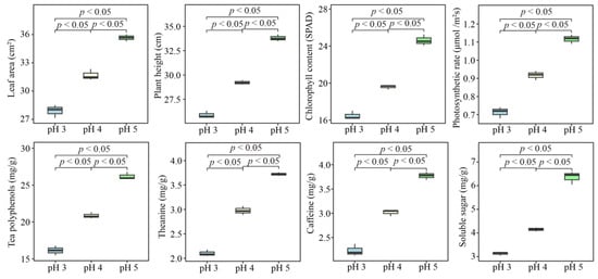 Based on the above roles of the seven key elements in the plant growth process, this study posits that changes in soil pH could potentially affect the enrichment of these seven elements. Consequently, this could affect the growth, photosynthesis capacity and quality of tea plants. To test this hypothesis, this study adjusted the pH of soil potting tea plant seedlings to three different levels (pH 3, 4 and 5). The effects on growth indexes, photosynthetic physiological indexes and quality indexes were then analyzed. The results showed (Figure 6) that the growth indexes (leaf area and plant height), photosynthesis physiological indexes (chlorophyll content and photosynthetic rate) and quality indexes (tea polyphenols, theanine, caffeine and soluble sugar) of tea plants showed a significant increase with the increase of soil pH. Specifically, leaf area and plant height increased from 27.90 to 35.66 cm2 and 25.88 to 33.80 cm, respectively. Chlorophyll content and photosynthetic rate increased from 16.50 to 24.61 SPAD and 0.71 to 1.12 μmol /m2s, respectively. Tea polyphenols, theanine, caffeine and soluble sugar increased from 16.14 to 26.18 mg/kg, 2.10 to 3.72 mg/kg, 2.23 to 3.77 mg/kg and 3.12 to 6.36 mg/kg, respectively. These findings suggest that an increase in soil pH could potentially enhance the growth, photosynthesis capacity and quality of tea plants.