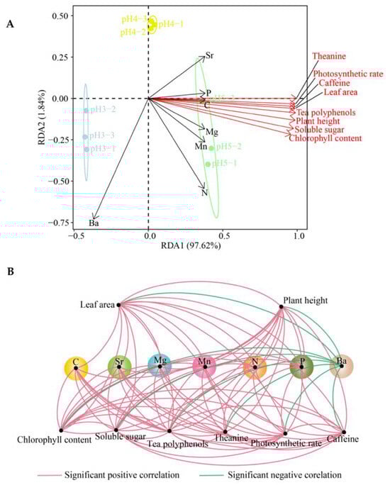 In addition, this study further analyzed the interactions between the seven key elements and tea plant growth indexes, photosynthesis indexes and quality indexes. Redundancy analysis showed (Figure 7A) that there were significant correlations between six key elements (N, Mn, C, P, Sr and Mg) and growth indexes, photosynthesis indexes and quality indexes of tea plants. Correlation network analysis showed (Figure 7B) that there was a significant positive correlation between the six key elements (N, Mn, C, P, Sr and Mg) and the growth indexes, photosynthesis indexes and quality indexes of the tea plant, while Ba showed a significant negative correlation. The results validated the above hypothesis, and also illustrated that, with the increase of soil pH, the enrichment capacity of N, Mn, C, P, Sr and Mg by tea leaves was enhanced, and that of Ba was reduced, which was conducive to the enhancement of photosynthesis capacity of tea plants, the promotion of their growth and the improvement of the quality of tea leaves.