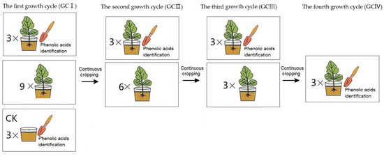 The treatment procedure of muskmelon seedlings for phenolic acids identification: In GCI, a pot seedling treatment (three replicates) and the control (CK, three replicates) were performed for soil phenolic acid determination, while nine pot seedlings were continuously cropped for the second growth cycle. In GCII, a pot seedling treatment (three replicates) was performed for soil phenolic acid determination, while six pot seedlings were continuously cropped for the third growth cycle. In GCIII, a pot seedling treatment (three replicates) was performed for soil phenolic acid determination, while three pot seedlings were continuously cropped for the fourth growth cycle. In GCIV, a pot seedling treatment (three replicates) performed for soil phenolic acid determination.