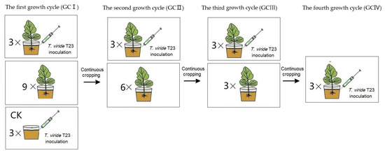 The treatment procedure of muskmelon seedlings for the effect of T. viride T23. In GCI, pot seedling treatments with T. viride T23 (three replicates) and without T. viride T23 (three replicates) were performed for growth index determination, while eighteen pot seedlings were continuously cropped for the second growth cycle. In GCII, pot seedling treatments with T. viride T23 (three replicates) and without T. viride T23 (three replicates) were performed for growth index determination, while twelve pot seedlings were continuously cropped for the third growth cycle. In GCIII, pot seedling treatments with T. viride T23 (three replicates) and without T. viride T23 (three replicates) were performed for growth index determination, while six pot seedlings were continuously cropped for the fourth growth cycle. In GCIV, pot seedling treatments with T. viride T23 (three replicates) and without T. viride T23 (three replicates) were performed for growth index determination.