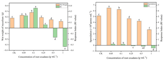 Effects of muskmelon root exudates on mycelium growth and sporulation of T. viride T23. Note: Different lowercase letters indicate significant differences in mycelium growth and the sporulation of T. viride T23 at distinct concentrations of root exudates.