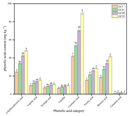 Contents of phenolic acids of continuous cropping soils in muskmelon (mg·kg−1 dry soil). GCI: the first growth cycle, GCII: the second growth cycle, GCIII: the third growth cycle, GCIV: the fourth growth cycle of continuous cropping. Note: Different lowercase letters indicate significant differences in concentration of the phenolic acid in different growth cycles.