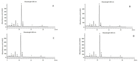 Chromatograms of phenolic acids detected with HPLC in continuous growth cycles in soil of muskmelon. (A–D): Chromatograms of phenolic acid detected with HPLC in the soil from the first growth cycle to the fourth growth cycle. Phenolic acids: 1. ρ-hydroxybenzoic acid (6.833 min); 2. Vanillic acid (7.479 min); 3. Syringic acid (7.971 min); 4. Vanillin (9.475 min); 5. Coumaric acid (11.037 min); 6. Ferulic acid (11.612 min); 7. Benzoic acid (15.236 min); 8. Cinnamic acid (19.606 min).