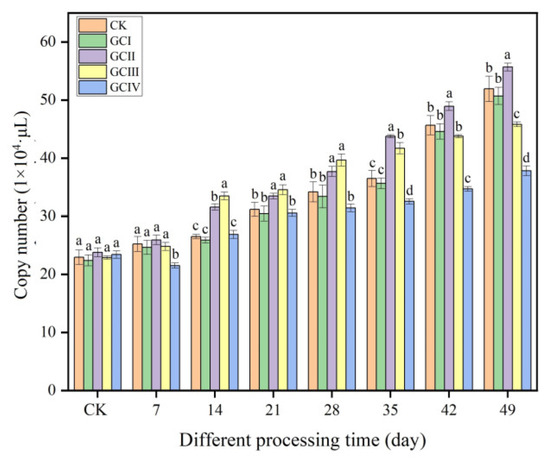 Within a period of 7 weeks, the quantities of Trichoderma in the soil of muskmelon, across various continuous growth cycles, demonstrated a clear trend of increasing, as illustrated in Figure 8. Similar to the ungrown muskmelon control, T. viride T23 effectively colonized the rhizosphere soil of muskmelon during both the first and second growth cycles. Specifically, at 49 days after inoculation, the population density reached 5.07 × 105 copies/μL in the first cycle (GCI) and 5.56 × 105 copies/μL in the second cycle (GCII). The colonization of T. viride T23 in the third growth cycle (GCIII) of continuously cropped soil exceeded that observed in GCI and GCII during the initial 14 to 28 days after inoculation. However, this colonization rate slowed down significantly from 35 to 49 days post-inoculation. In the fourth growth cycle (GCIV), the population density of T. viride T23 in the continuously cropped soil was significantly lower compared to that in GCI, GCII, and GCIII. Specifically, at 49 days after inoculation, the population density was 3.78 × 105 copies/μL and 3.58 × 105 copies/μL, respectively. This observation suggests that continuous cropping exerted a notable influence on the colonization pattern of T. viride T23 within the rhizosphere soil of muskmelon.
