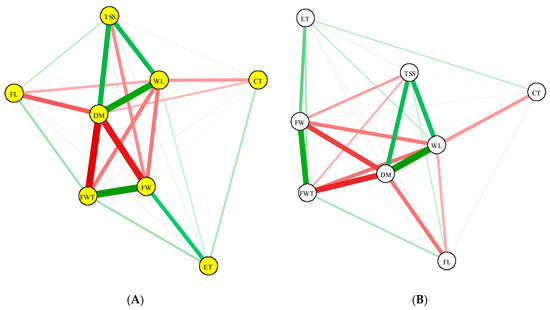 Correlation network for phenotypic (A) and genotypic (B) for water loss of chili peppers. (CT = cuticle thickness; ET = exocarp thickness; FW = fruit width; FL = fruit length; TSS = total soluble solids; DM = dry matter content; FWT = fruit wall thickness; WL = water loss).
