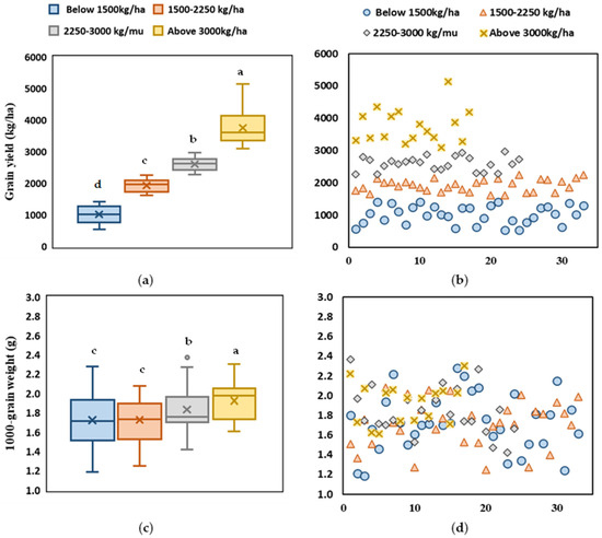 The grain yield (a,b) and thousand-grain weight (c,d) for different quinoa accessions. Different letters indicate significant differences among mean values using the Tukey HSD test (p ≤ 0.05).